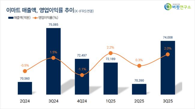주영훈 NH투자증권 애널리스트는 “3분기는 이마트 영업환경에 부정적 요인이 많았다”며 “민생회복 소비쿠폰 사용불가 업종이어서 장보기 수요가 감소했고 추석 시점 차이 영향이 발생했다”고 전했다.