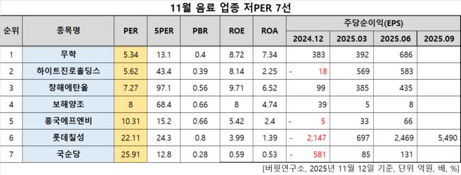 11월 음료주 저PER 7선. [자료=버핏연구소]