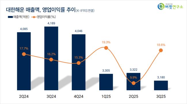 한편 “대한해운 3분기 영업이익은 전년동기대비 12% 감소한 593억원을 기록했다”며 “연간으로는 36% 감익이 예상되는데 지난해 오송 아파트 분양사업에서 얻은 일회성 이익이 사라졌고 VLCC 4척과 노후 벌크선 6척을 매각하며 자산 효율화에 더 집중했기 때문”이라고 설명했다.