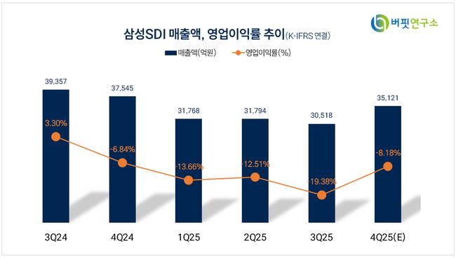 삼성SDI 매출액 비중. [자료=버핏연구소]유민기 상상인증권 연구원은 “2025년 4분기 실적 매출액 3조4000억원, 영업적자 4083억원으로 컨센서스 하회를 예상한다”며 “다양한 유형의 친환경 차량 사업부 관련 유럽 내 주요 고객사인 BMW향 물량 감소에 따른 보상금 1000억원 내외가 반영될 것을 고려했다”라고 밝혔다.