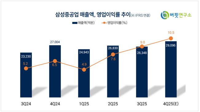 이서연 상상인증권 애널리스트는 삼성중공업의 4분기 연결실적으로 매출액 2조8202억원(전년동기대비 +4%), 영업이익 3002억원(전년동기대비 +72%)을 기록하며 시장 기대치에 부합할 것으로 전망했다. 4분기 영업일수는 전분기와 유사하나 저선가 상선 비중 감소 및 고선가 물량 반영, 생산•저장•하역설비(FLNG) 진행률 인식 본격화에 따른 해양 비중 확대로 믹스개선이 지속되며 영업이익률(OPM) 개선세를 이어갈 것으로 예상했다.