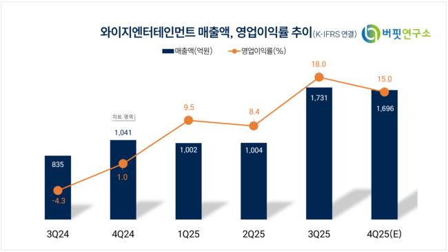 임수진 키움증권 애널리스트는 "지난해 4분기 매출액은 1543억원(전년동기대비 +48.3%), 영업이익은 236억원(전년동기대비 +2274%)으로 시장 기대치보다 소폭 하회할 것"으로 예상했다. 이는 "베이비몬스터 음반 판매량이 기대치를 하회하고 콘텐츠 제작 및 마케팅 비용을 선제적으로 확대한 영향"이라고 분석했다.