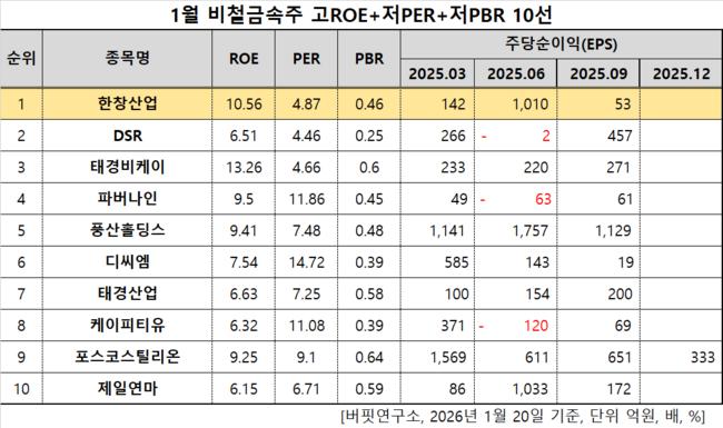 버핏연구소 조사 결과 한창산업이 1월 비철금속주 고ROE+저PER+저PBR 1위를 차지했으며, DSR(155660), 태경비케이(014580), 파버나인(177830)가 뒤를 이었다.