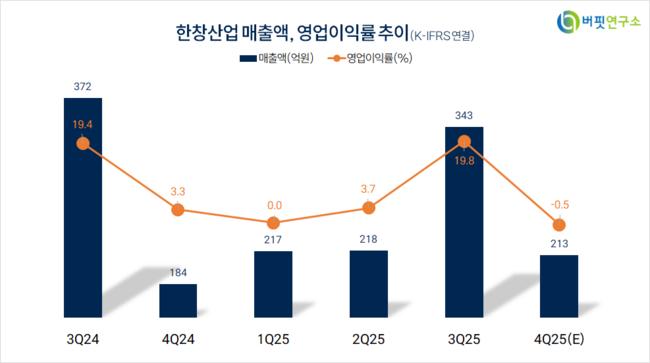 한창산업 최근 분기별 매출액, 영업이익률 추이. [자료=버핏연구소]