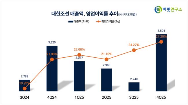 김대성 DS투자증권 애널리스트는 “대한조선의 지난해 4분기 영업이익은 953억원(전년동기대비 +36.3%)을 기록하며 시장 컨센서스를 18% 상회했다”며 “특히 영업이익률(OPM)은 27.2%로 조선 업계 최고 수준의 실적을 달성했다”고 밝혔다.