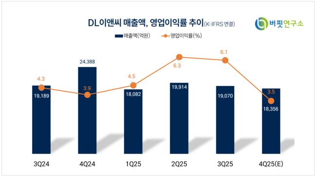 이어 "DL이앤씨는 올해 경영계획으로 신규수주 12조5000억원, 매출액 7조2000억원을 제시했다"며 "DL이앤씨 별도 매출액은 주택 매출 회복 영향으로 소폭 증가하는 반면, DL건설에 매출 감소가 집중될 것으로 내다봤다"고 전했다.