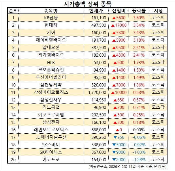 이어 현대차(005380, 49만 8500원, ▲ 1만 8000, 3.75%), 기아(000270, 15만 9900원, ▲ 5200, 3.36%), 에이비엘바이오(298380, 19만 1800원, ▲ 6000, 3.23%), 알테오젠(196170, 38만 7000원, ▲ 9000, 2.38%), 리가켐바이오(141080, 18만 2600원, ▲ 4100, 2.30%), HLB(028300, 5만 3100원, ▲ 1000, 1.92%), 코오롱티슈진(950160, 9만 4900원, ▲ 1400, 1.50%), 두산에너빌리티(034020, 9만 5600원, ▲ 1500, 1.59%), 삼천당제약(000250, 52만 1000원, ▲ 8000, 1.56%), 삼성바이오로직스(207940, 172만원, ▲ 1만, 0.58%), 삼성전자우(005935, 11만 4800원, ▲ 500, 0.44%), 리노공업(058470, 9만 6500원, ▼ 100, -0.10%), 에코프로비엠(247540, 20만 3000원, ▲ 1000, 0.50%), 삼성전자(005930, 16만 6000원, ▲ 200, 0.12%), 레인보우로보틱스(277810, 66만 8000원, ▼ 0, 0.00%), LG에너지솔루션(373220, 39만 1000원, ▲ 500, 0.13%), SK스퀘어(402340, 53만 5500원, ▼ 7500, -1.38%), SK하이닉스(000660, 86만 4000원, ▼ 1만 2000, -1.37%), 에코프로(086520, 15만 4000원, ▼ 2000, -1.28%) 순이다.