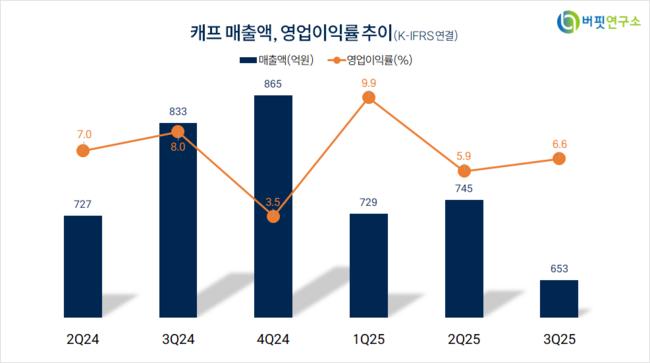 캐프는 지난 3분기 매출액 653억원, 영업이익 43억원으로 전년동기대비 각각 21.6%, 35.8% 감소했다(K-IFRS 연결).