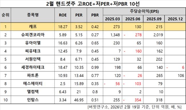 버핏연구소 조사 결과 캐프가 2월 핸드셋주 고ROE+저PER+저PBR 1위를 차지했으며, 슈피겐코리아(192440), 유아이엘(049520), 씨유테크(376290)가 뒤를 이었다.