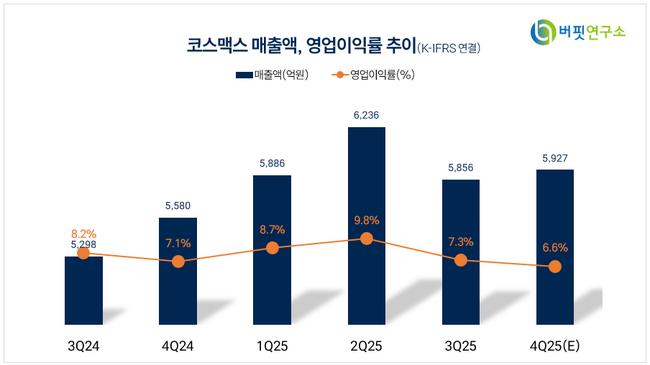 국내(별도) 매출은 3597억원(+4%)으로 색조 일부 품목 부진과 계절성 영향으로 성장세가 둔화됐다. 다만 2월 현재 별도 법인 매출이 약 15% 내외 성장하며 회복 흐름을 보이고 있다는 설명이다. NH투자증권은 2026년 한국 화장품 수출(HS Code 3304)이 전년 대비 14% 증가할 것으로 추정하며, 코스맥스 역시 유사한 성장률을 기록할 것으로 전망했다.