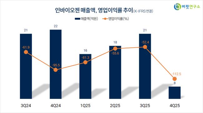 인바이오젠은 4분기 매출액 8억원, 영업손실 9억원으로 전년동기대비 매출액은 63.6% 감소, 영업손실은 12억원 축소됐다(K-IFRS 연결).