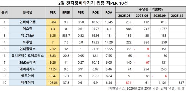버핏연구소 조사 결과에 따르면 인바이오젠이 2월 전자장비와기기주 PER 3.84배로 가장 낮았다. 이어 에스텍(069510)(4.3), 백금T&A(046310)(6.25), 트루엔(417790)(7)가 뒤를 이었다.
