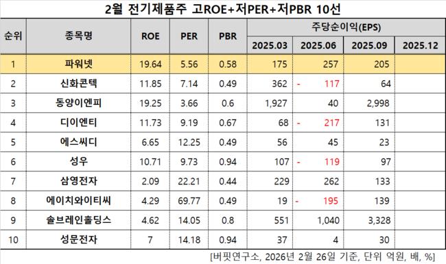 버핏연구소 조사 결과 파워넷이 2월 전기제품주 고ROE+저PER+저PBR 1위를 차지했으며, 신화콘텍(187270), 동양이엔피(079960), 디이엔티(079810)가 뒤를 이었다.